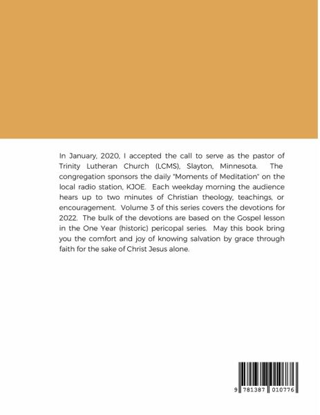 Every morning in Slayton, Minnesota, the people listening to the local radio station, KJOE, hear the "Moments of Meditation" sponsored by Trinity Lutheran Church (LCMS). Here are the devotions which were aired in 2022. For the most part, the 2022 Moments of Meditation are based on the Gospel reading as found in the One Year (historic) pericopal system. We strive to properly divide God's Law and Gospel as we bring the good news of salvation by grace through faith to our community. Each devotion, when recorded, is less than two minutes long, which provides a challenge to concisely speak of God's grace, love, and mercy.