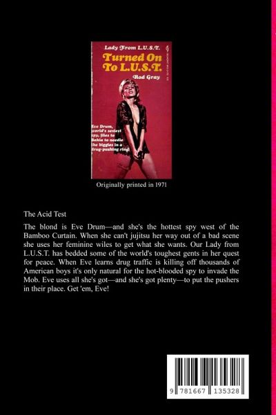 Originally printed in 1980. This is a New Edition rePrint by the Gardner Francis Fox Library LLC. This story is about The Acid Test The blond is Eve Drum-and she's the hottest spy west of the Bamboo Curtain. When she can't jujitsu her way out of a bad scene she uses her feminine wiles to get what she wants. Our Lady from L.U.S.T. has bedded some of the world's toughest gents in her quest for peace. When Eve learns drug traffic is killing off thousands of American boys it's only natural for the hot-blooded spy to invade the Mob. Eve uses all she's got-and she's got plenty-to put the pushers in their place. Get 'em, Eve!