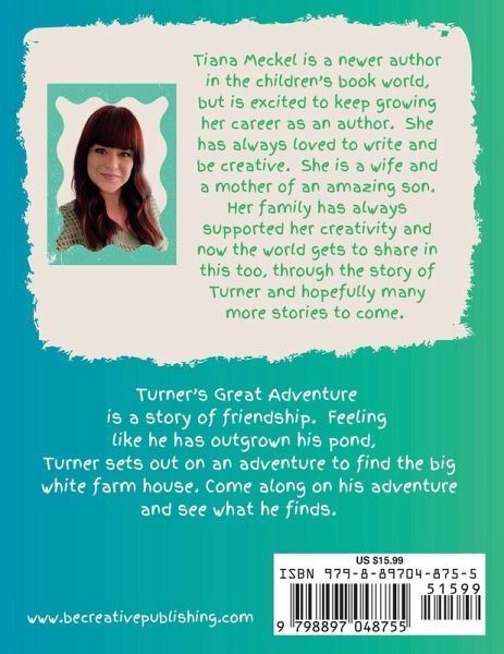 Turner's Great Adventure is a story of friendship and trying new things. Feeling like he has outgrown his pond, Turner sets out on an adventure to find the big white farm house. While on his adventure he makes a big discovery about his life that was shown to him by a new friend. Come along on his adventure and see what he finds.