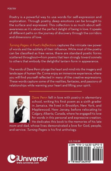 Dave Penn fell in love with poetry in elementary school, writing his first poem as a sixth grader in Jamaica. He lived in Brooklyn, New York, and Maplewood, New Jersey, before relocating to Calgary, Alberta, Canada, where he engaged his love for words in this personal and expressive creation. He dedicates this book to the memories of his late mom and dad, whose lives demonstrated a love for God, people, and service. Turning Pages is his first anthology.