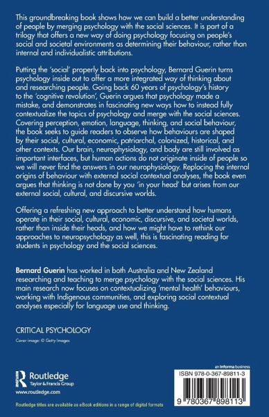 This groundbreaking book shows how we can build a better understanding of people by merging psychology with the social sciences. It is part of a trilogy that offers a new way of doing psychology focusing on people's social and societal environments as determining their behaviour, rather than internal and individualistic attributions. Putting the 'social' properly back into psychology, Bernard Guerin turns psychology inside out to offer a more integrated way of thinking about and researching people. Going back 60 years of psychology's history to the 'cognitive revolution', Guerin argues that psychology made a mistake, and demonstrates in fascinating new ways how to instead fully contextualize the topics of psychology and merge with the social sciences. Covering perception, emotion, language, thinking, and social behaviour, the book seeks to guide readers to observe how behaviours are shaped by their social, cultural, economic, patriarchal, colonized, historical, and other contexts. Our brain, neurophysiology, and body are still involved as important interfaces, but human actions do not originate inside of people so we will never fi nd the answers in our neurophysiology. Replacing the internal origins of behaviour with external social contextual analyses, the book even argues that thinking is not done by you 'in your head' but arises from our external social, cultural, and discursive worlds. Offering a refreshing new approach to better understand how humans operate in their social, cultural, economic, discursive, and societal worlds, rather than inside their heads, and how we might have to rethink our approaches to neuropsychology as well, this is fascinating reading for students in psychology and the social sciences.