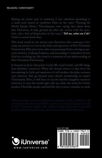 During my senior year at seminary, I was substitute preaching at a small rural church in southwest Ohio on the topic: "Turning the World Upside Down." Thessalonians were saying that about those first Christians. A lady greeted me after the service with the question, and a hint of desperation in her voice: "Tell me, what can I do?" I had no answer back then. This book would be my answer now. Sometime after seminary, it became my passion to recover the faith and experience of New Testament Christianity. Fifty years later, after encountering Christ, serving in pastoral ministry, studying Scripture, and journaling to remember lessons God was teaching me, this book is a summary of my understanding of New Testament Christianity. It focused on Jesus (Incarnate Lord), His word (truth), and His kingdom (limitless resources). When the church returns to that focus for determining its faith and experience, it will produce disciples, servants, and witnesses that go beyond mere church membership in today's Christianity. Then, it will learn to tap the limitless kingdom resources necessary to turn the world right side up, claim the earth for Christ, produce Christlike people, and lead the way to peace someday on earth.