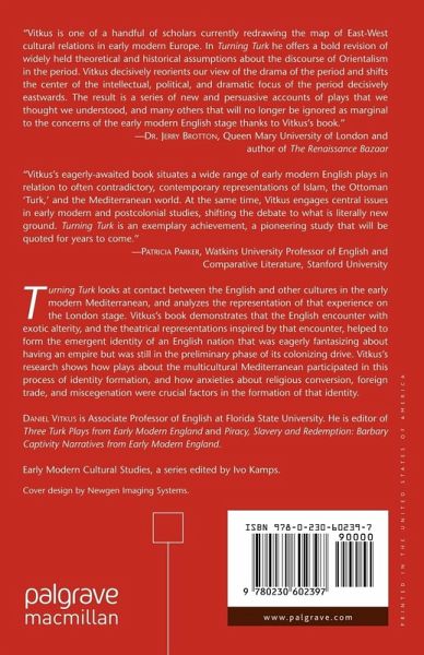 Turning Turk looks at contact between the English and other cultures in the early modern Mediterranean, and analyzes the representation of that experience on the London stage. Vitkus's book demonstrates that the English encounter with exotic alterity, and the theatrical representations inspired by that encounter, helped to form the emergent identity of an English nation that was eagerly fantasizing about having an empire, but was still in the preliminary phase of its colonizing drive. Vitkus' research shows how plays about the multi-cultural Mediterranean participated in this process of identity formation, and how anxieties about religious conversion, foreign trade and miscegenation were crucial factors in the formation of that identity.