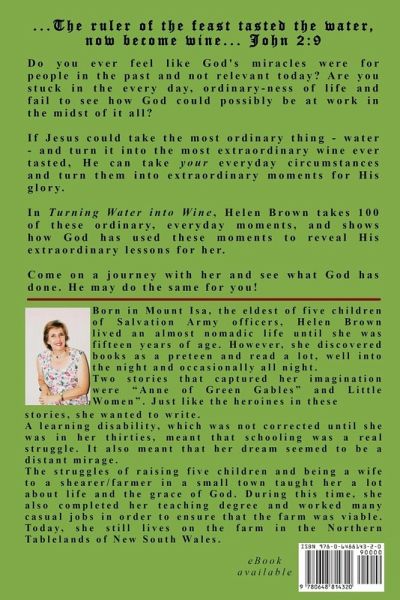 Do you ever think about the miracle of the water turning to wine? Do you ever wonder what the relevance of that might be for you today? In "Turning Water into Wine", Helen Brown takes 100 ordinary "water" moments and describes how God has used these to teach her valuable lessons about life and His love for her.