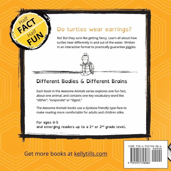 Sea turtle book for kids ages 0-5Can a turtle wear headphones? No! But they'd be good drummers. In this light-hearted picture book about turtles, learn about all the different types of sounds turtles can hear, and make. Turtles Have Secret Ears is perfect for home or for classroom read alouds. Kids love shouting out the answers to silly questions like "Can a turtle wear earrings?" This call and response format is a time-tested method for keeping kids engaged and interacting, instead of just chewing on the pages. Fun facts about every kid's favorite amphibian! Excellent for teaching STEM topics about hearing, ears and sound. ¿Parents and kids love it. - "With lots of giggles! I honestly recommend these books to my fellow parents and their children." - "I read with my kids and they had so much fun responding to all the funny questions in the book." - "Perfect for all ages and laugh out loud funny." ¿Book 5 of 6 in the Awesome Animals Series Other books in the series:Snakes Have No Legs Pigs Never Sweat Geckos Don't Blink Cows Have No Top Teeth Turtles Have Secret Ears Chicks Don't Eat Candy The Awesome Animals series is a collection of weird but true books for kids about the animal kingdom. Half fact and half fun, each book features an animal which is missing something that we're taught to expect should be there. But these animals don't just thrive despite that absence, they thrive because of it. All books use a dyslexia-friendly type-face. With dyslexia, we often focus on the challenges - difficulty reading. But thanks to the way the dyslexic brain is built, people with dyslexia are often creative, intuitive and highly successful. In other words, those people aren't thriving despite their dyslexic brain, they are thriving because of it.¿