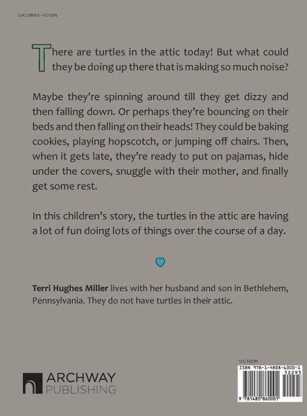 There are turtles in the attic today! But what could they be doing up there that is making so much noise? Maybe theyre spinning around till they get dizzy and then falling down. Or perhaps theyre bouncing on their beds and then falling on their heads! They could be baking cookies, playing hopscotch, or jumping off chairs. Then, when it gets late, theyre ready to put on pajamas, hide under the covers, snuggle with their mother, and finally get some rest. In this childrens story, the turtles in the attic are having a lot of fun doing lots of things over the course of a day.