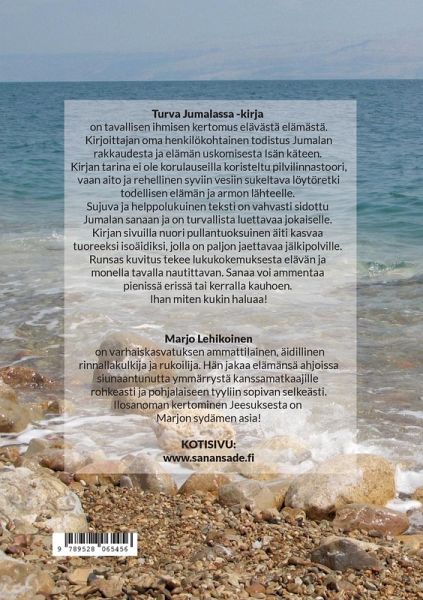 Turva Jumalassa -kirja on tavallisen ihmisen kertomus elävästä elämästä. Kirjoittajan oma henkilökohtainen todistus Jumalan rakkaudesta ja elämän uskomisesta Isän käteen. Kirjan tarina ei ole korulauseilla koristeltu pilvilinnastoori, vaan aito ja rehellinen syviin vesiin sukeltava löytöretki todellisen elämän ja armon lähteelle. Sujuva ja helppolukuinen teksti on vahvasti sidottu Jumalan sanaan ja turvallista luettavaa jokaiselle. Kirjan sivuilla nuori pullantuoksuinen äiti kasvaa tuoreeksi isoäidiksi, jolla on paljon jaettavaa jälkipolville. Runsas kuvitus tekee lukukokemuksesta elävän ja monella tavalla nautittavan. Sanaa voi ammentaa pienissä erissä tai kerralla kauhoen. Ihan miten kukin haluaa!