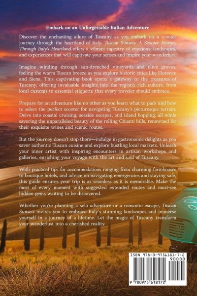 Embark on an Unforgettable Italian Adventure Discover the enchanting allure of Tuscany as you embark on a scooter journey through the heartland of Italy. Tuscan Sunsets: A Scooter Journey Through Italy's Heartland offers a vibrant tapestry of emotions, landscapes, and experiences that will captivate your senses and inspire your wanderlust. Imagine winding through sun-drenched vineyards and olive groves, feeling the warm Tuscan breeze as you explore historic cities like Florence and Siena. This captivating book opens a gateway to the treasures of Tuscany, offering invaluable insights into the region's rich culture, from local customs to essential etiquette that every traveler should embrace. Prepare for an adventure like no other as you learn what to pack and how to select the perfect scooter for navigating Tuscany's picturesque terrain. Delve into coastal cruising, seaside escapes, and island hopping, all while savoring the unparalleled beauty of the rolling Chianti hills, renowned for their exquisite wines and scenic routes. But the journey doesn't stop there-indulge in gastronomic delights as you savor authentic Tuscan cuisine and explore bustling local markets. Unleash your inner artist with inspiring encounters in artisan workshops and galleries, enriching your voyage with the art and soul of Tuscany. With practical tips for accommodations ranging from charming farmhouses to boutique hotels, and advice on navigating emergencies and staying safe, this guide ensures your trip is as seamless as it is memorable. Make the most of every moment with suggested extended routes and must-see hidden gems waiting to be discovered. Whether you're planning a solo adventure or a romantic escape, Tuscan Sunsets invites you to embrace Italy's stunning landscapes and immerse yourself in a journey of a lifetime. Let the magic of Tuscany transform your wanderlust into a cherished reality.
