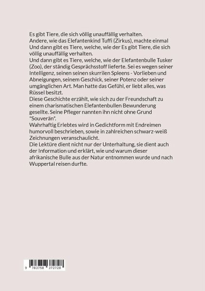 Es gibt Tiere, die sich völlig unauffällig verhalten. Andere, wie das Elefantenkind Tuffi (Zirkus), machte einmal Und dann gibt es Tiere, welche, wie der Es gibt Tiere, die sich völlig unauffällig verhalten.Und dann gibt es Tiere, welche, wie der Elefantenbulle Tusker (Zoo), der ständig Gesprächsstoff lieferte. Sei es wegen seiner Intelligenz, seinen seinen skurrilen Spleens - Vorlieben und Abneigungen, seinem Geschick, seiner Potenz oder seiner umgänglichen Art. Man hatte das Gefühl, er liebt alles, was Rüssel besitzt. Diese Geschichte erzählt, wie sich zu der Freundschaft zu einem charismatischen Elefantenbullen Bewunderung gesellte. Seine Pfleger nannten ihn nicht ohne Grund "Souverän".Wahrhaftig Erlebtes wird in Gedichtform mit Endreimen humorvoll beschrieben, sowie in zahlreichen schwarz-weiß Zeichnungen veranschaulicht.Die Lektüre dient nicht nur der Unterhaltung, sie dient auch der Information und erklärt, wie und warum dieser afrikanische Bulle aus der Natur entnommen wurde und nach Wuppertal reisen durfte.