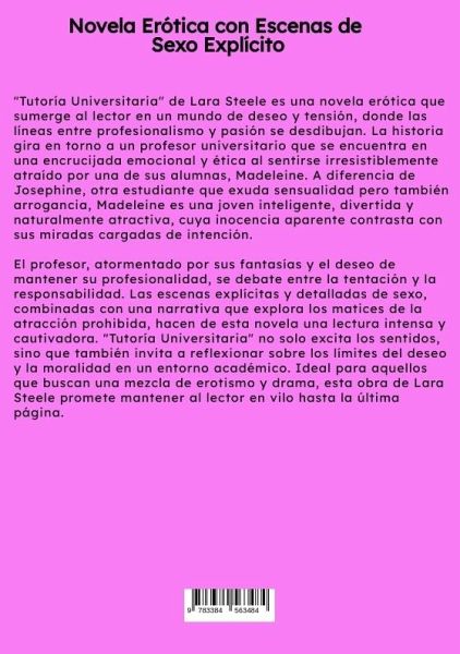 "Tutoría Universitaria" de Lara Steele es una novela erótica que sumerge al lector en un mundo de deseo y tensión, donde las líneas entre profesionalismo y pasión se desdibujan. La historia gira en torno a un profesor universitario que se encuentra en una encrucijada emocional y ética al sentirse irresistiblemente atraído por una de sus alumnas, Madeleine. A diferencia de Josephine, otra estudiante que exuda sensualidad pero también arrogancia, Madeleine es una joven inteligente, divertida y naturalmente atractiva, cuya inocencia aparente contrasta con sus miradas cargadas de intención.El profesor, atormentado por sus fantasías y el deseo de mantener su profesionalidad, se debate entre la tentación y la responsabilidad. Las escenas explícitas y detalladas de sexo, combinadas con una narrativa que explora los matices de la atracción prohibida, hacen de esta novela una lectura intensa y cautivadora. "Tutoría Universitaria" no solo excita los sentidos, sino que también invita a reflexionar sobre los límites del deseo y la moralidad en un entorno académico. Ideal para aquellos que buscan una mezcla de erotismo y drama, esta obra de Lara Steele promete mantener al lector en vilo hasta la última página.