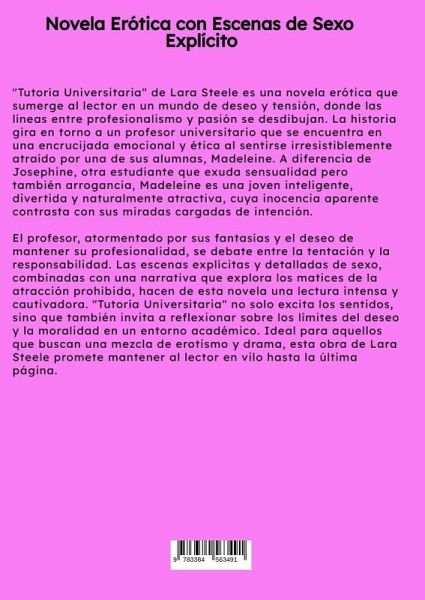 "Tutoría Universitaria" de Lara Steele es una novela erótica que sumerge al lector en un mundo de deseo y tensión, donde las líneas entre profesionalismo y pasión se desdibujan. La historia gira en torno a un profesor universitario que se encuentra en una encrucijada emocional y ética al sentirse irresistiblemente atraído por una de sus alumnas, Madeleine. A diferencia de Josephine, otra estudiante que exuda sensualidad pero también arrogancia, Madeleine es una joven inteligente, divertida y naturalmente atractiva, cuya inocencia aparente contrasta con sus miradas cargadas de intención.El profesor, atormentado por sus fantasías y el deseo de mantener su profesionalidad, se debate entre la tentación y la responsabilidad. Las escenas explícitas y detalladas de sexo, combinadas con una narrativa que explora los matices de la atracción prohibida, hacen de esta novela una lectura intensa y cautivadora. "Tutoría Universitaria" no solo excita los sentidos, sino que también invita a reflexionar sobre los límites del deseo y la moralidad en un entorno académico. Ideal para aquellos que buscan una mezcla de erotismo y drama, esta obra de Lara Steele promete mantener al lector en vilo hasta la última página.