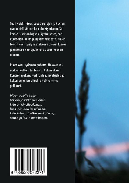 Tuuli kuiskii- teos kuvaa sanojen ja kuvien avulla sisäistä matkaa eheytymiseen. Se kertoo sisäisen lapsen löytämisestä, sen kuuntelemisesta ja hyväksymisestä. Kirjan tekstit ovat syntyneet itsessä olevan lapsen ja aikuisen vuoropuheluna usean vuoden aikana. Runot ovat sydämen puhetta. Ne ovat sanoiksi puettuja tunteita ja kokemuksia. Runojen mukana voit tuntea, myötäelää ja kokea omia tunteitasi ja kulkea omaa polkuasi. Näen polulla keijun, herkän ja kirkaskatseisen. Hän on ainutlaatuinen, lapsi niin aito ja suloinen. Hän kutsuu sinutkin seikkailuun, sadun ja leikin maailmaan.