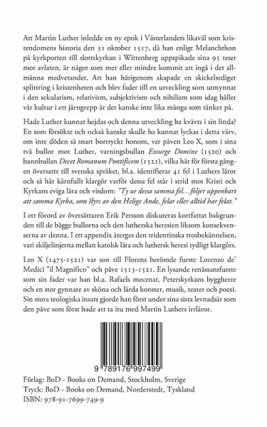 Hade Luther kunnat hejdas och denna utveckling ha kvävts i sin linda? En som försökte och också kanske skulle ha kunnat lyckas i detta värv, om inte döden så snart bortryckt honom, var påven Leo X, som i sina två bullor mot Luther, varningsbullan "Exsurge Domine" (1520) och bannbullan "Decet Romanum Pontificem" (1521), vilka här för första gången översatts till svenska språket, bl.a. identifierar 41 fel i Luthers läror och så här kärnfullt klargör varför dessa fel står i strid mot Kristi och Kyrkans eviga lära och visdom: "Ty ur dessa samma fel...följer uppenbart att samma Kyrka, som styrs av den Helige Ande, felar eller alltid har felat."