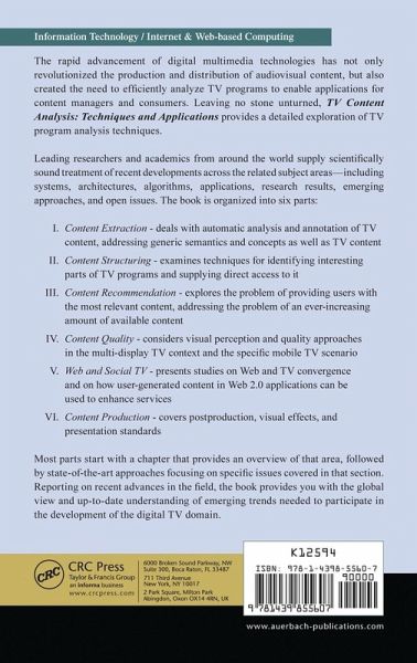 Leaving no stone unturned, this book provides a detailed exploration of TV program analysis techniques. It supplies scientifically sound treatment of the state-of-the-art across the related subject areas-such as systems, architectures, algorithms, applications, research results, emerging approaches, and open issues. The book includes coverage of content extraction, content structuring, content recommendation, content quality, web and social TV, and content production.