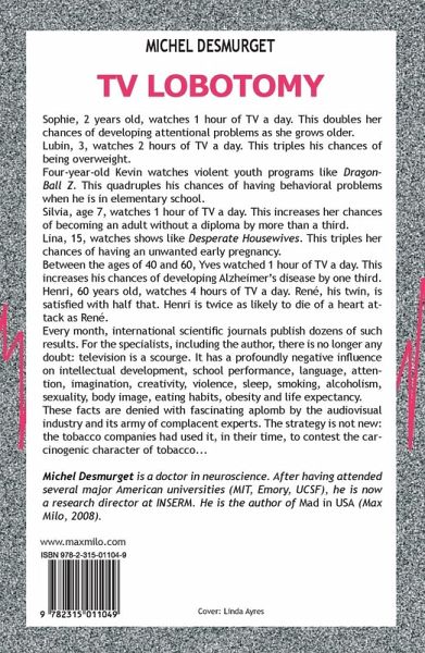 Sophie, 2 years old, watches 1 hour of TV a day. This doubles her chances of developing attentional problems as she grows older.Lubin, 3, watches 2 hours of TV a day. This triples his chances of being overweight.Four-year-old Kevin watches violent youth programs like DragonBall Z. This quadruples his chances of having behavioral problems when he is in elementary school.Silvia, age 7, watches 1 hour of TV a day. This increases her chances of becoming an adult without a diploma by more than a third.Lina, 15, watches shows like Desperate Housewives. This triples her chances of having an unwanted early pregnancy.Between the ages of 40 and 60, Yves watched 1 hour of TV a day. This increases his chances of developing Alzheimer's disease by one third.Henri, 60 years old, watches 4 hours of TV a day. René, his twin, is satisfied with half that. Henri is twice as likely to die of a heart attack as René.Every month, international scientific journals publish dozens of such results. For the specialists, including the author, there is no longer any doubt: television is a scourge. It has a profoundly negative influence on intellectual development, school performance, language, attention, imagination, creativity, violence, sleep, smoking, alcoholism, sexuality, body image, eating habits, obesity and life expectancy.These facts are denied with fascinating aplomb by the audiovisual industry and its army of complacent experts. The strategy is not new: the tobacco companies had used it, in their time, to contest the carcinogenic character of tobacco...