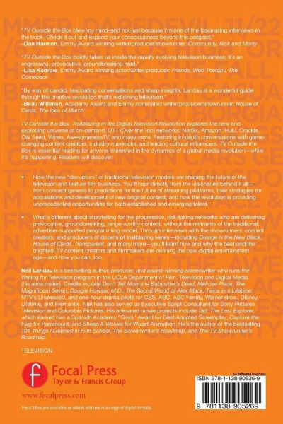 TV Outside the Box: Trailblazing in the Digital Television Revolution explores the new and exploding universe of on-demand, OTT (Over the Top) networks: Netflix, Amazon, Hulu, Crackle, CW Seed, Vimeo, AwesomenessTV, and many more. Featuring in-depth conversations with game-changing content creators, industry mavericks, and leading cultural influencers, TV Outside the Box is essential reading for anyone interested in the dynamics of a global media revolution - while it's happening. Readers will discover: How the new "disruptors" of traditional television models are shaping the future of the television and feature film business. You'll hear directly from the visionaries behind it all - from concept genesis to predictions for the future of streaming platforms; their strategies for acquisitions and development of new original content; and how the revolution is providing unprecedented opportunities for both established and emerging talent. What's different about storytelling for the progressive, risk-taking networks who are delivering provocative, groundbreaking, binge-worthy content, without the restraints of the traditional, advertiser-supported programming model. Through interviews with the showrunners, content creators, and producers of dozens of trailblazing series - including Orange Is the New Black, House of Cards, Transparent, and many more - you'll learn how and why the best and the brightest TV content creators and filmmakers are defining the new digital entertainment age - and how you can, too.