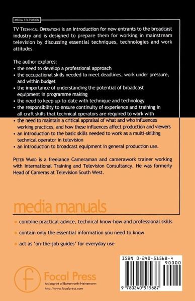 TV Technical Operations is an introduction for new entrants to the broadcast industry and is designed to prepare them for working in mainstream television by discussing essential techniques, technologies and work attitudes. The author explores:* the need to develop a professional approach* the occupational skills needed to meet deadlines, work under pressure and within budget* the importance of understanding the potential of broadcast equipment in program making* the need to keep up to date with the technique and technology* the responsibility to ensure continuity of experience and training in all craft skills that technical operators are required to work with* the need to maintain a critical appraisal of what and who influences working practices and how these influences affect production and viewers* an introduction to the basic skills needed to work as a multi-skilling technical operator in television* an introduction to broadcast equipment in general production usePeter Ward is a freelance cameraman and camerawork trainer working with international training and television consultancy. He was formerly head of cameras at Television South West.