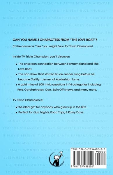 "Highlight of our Road Trip was having fun with this book!" Sick of friends and family staring at their phone screens? If they watched any TV in the 80s, this book will get the party going... Organized into fun categories like cars, pets, actors, and theme songs, TV Trivia Champion quickly gets the competitive juices flowing. Expect lively debates about favorite shows and actors. You'll be shocked how much you remember from your favorite shows of the 1980s. Fletcher Malone spent 100's of hours researching more than 70 TV shows to bring you all original questions. Many of the answers include bonus facts and behind the scenes information to add to your enjoyment. In TV Trivia Champion, you'll discover:Fascinating secrets about your favorite actors, shows, and characters. The onscreen connection between Fantasy Island and The Love Boat. The sitcom with 3 child actors who all ended up in jail. The cop show that starred Bruce Jenner, long before he became Cailtlyn Jenner of Kardashian fame. Over 200 PAGES of trivia questions in 14 CATEGORIES including Pets, Catchphrases, Cars, Spin Off shows, and many more. P.S.... TV Trivia Champion is:The ideal gift for anybody who grew up in the 80s. Perfect for quiz nights, road trips, and rainy days.