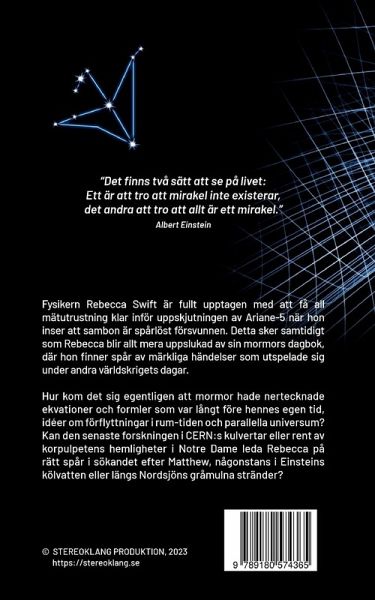 Fysikern Rebecca Swift är fullt upptagen med att få all mätutrustning klar inför uppskjutningen av Ariane-5 när hon inser att sambon är spårlöst försvunnen. Detta sker samtidigt som Rebecca blir allt mera uppslukad av sin mormors dagbok, där hon finner spår av märkliga händelser som utspelade sig under andra världskrigets dagar. Hur kom det sig egentligen att mormor hade nertecknade ekvationer och formler som var långt före hennes egen tid, idéer om förflyttningar i rum-tiden och parallella universum? Kan den senaste forskningen i CERN:s kulvertar eller rent av korpulpetens hemligheter i Notre Dame leda Rebecca på rätt spår i sökandet efter Matthew, någonstans i Einsteins kölvatten eller längs Nordsjöns gråmulna stränder?