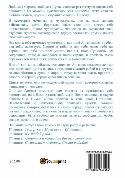 Amato Cuore, amata Anima, quante volte ti sei sentita sola? Ti puoi sentire sola anche se sei amata da una famiglia, da amici, da un compagno di vita. Perché? In alcuni momenti senti che da sola devi agire, vivere, lottare, anche se loro ti possono sostenere. Spesso senti che le parole non esprimono i tuoi sentimenti profondi, quindi ti è difficile far comprendere il tuo intimo. Questo libro ti aiuta a sentire come il tuo Angelo vive in te e per te, agisce e lotta con te e per te, ti conosce così bene che ti aiuta a scoprire chi sei, la tua Essenza, i tesori che vi sono nel tuo cuore e a vivere così il tuo potenziale umano e Divino. Il libro fa parte della seguente serie di libri che contengono i channeling donati dagli Angeli. Con questi messaggi gli Angeli ci aiutano a percorrere la Via per vivere in armonia con se stessi e con gli altri, nella serenità, nella pace, ad avere un cuore semplice e gioioso, un cuore di bimbo felice. Questi libri possono aiutare anche in un Cammino di crescita e di evoluzione. 1º libro: La tua mano nella Mia (2ª edizione); 2º libro: Ti sono accanto; 3º libro: Guarirsi e aiutare a guarire; 4º libro: Aiutare con la Luce e l'Amore.