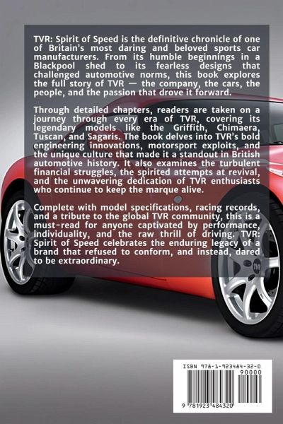 TVR: Spirit of Speed is the definitive chronicle of one of Britain's most daring and beloved sports car manufacturers. From its humble beginnings in a Blackpool shed to its fearless designs that challenged automotive norms, this book explores the full story of TVR - the company, the cars, the people, and the passion that drove it forward. Through detailed chapters, readers are taken on a journey through every era of TVR, covering its legendary models like the Griffith, Chimaera, Tuscan, and Sagaris. The book delves into TVR's bold engineering innovations, motorsport exploits, and the unique culture that made it a standout in British automotive history. It also examines the turbulent financial struggles, the spirited attempts at revival, and the unwavering dedication of TVR enthusiasts who continue to keep the marque alive. Complete with model specifications, racing records, and a tribute to the global TVR community, this is a must-read for anyone captivated by performance, individuality, and the raw thrill of driving. TVR: Spirit of Speed celebrates the enduring legacy of a brand that refused to conform, and instead, dared to be extraordinary.