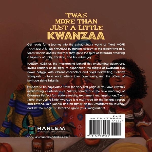 Get ready for a journey into the extraordinary world of 'TWAS MORE THAN JUST A LITTLE KWANZAA by Harlem Holiday! In this electrifying tale, follow Ronnie and his family as they ignite the spirit of Kwanzaa, weaving a tapestry of unity, tradition, and boundless joy. HARLEM HOLIDAY, the mastermind behind this enchanting adventure, invites readers of all ages to experience the magic of Kwanzaa like never before. With vibrant characters and vivid storytelling, Holiday transports us to a world where love, community, and the power of heritage shine brightly. Prepare to be captivated from the very first page as you dive into this exhilarating celebration of culture, family, and the true meaning of Kwanzaa. Perfect for readers seeking excitement and inspiration, 'Twas More Than Just a Little Kwanzaa is a must-read for the holiday season and beyond. Join Ronnie and his family on this unforgettable journey, and let the magic of Kwanzaa ignite your imagination!
