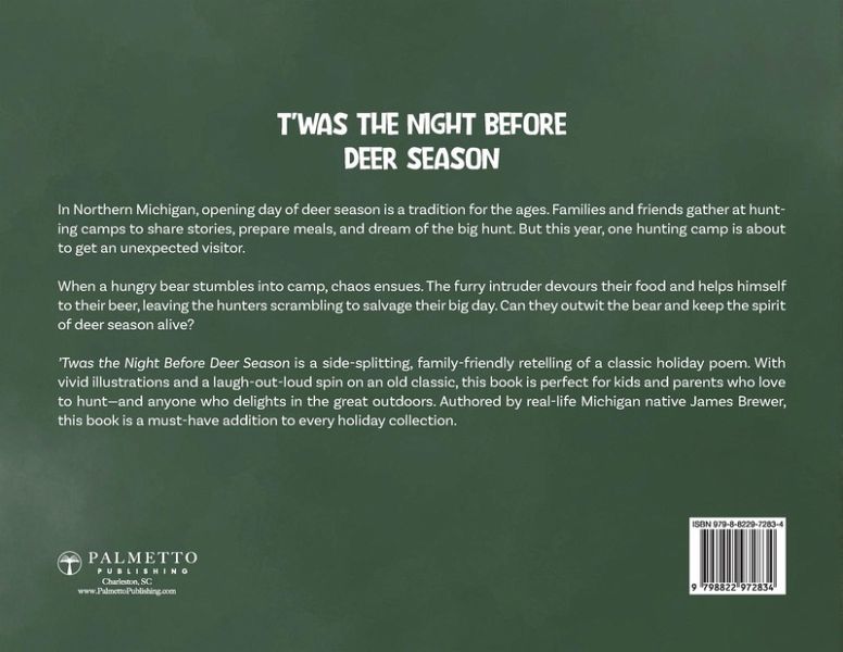 A hilarious twist on a holiday classic brings fun and festivities to hunting enthusiasts of all ages! Step into a Northern Michigan hunting camp and learn what makes the Christmas season special in the back woods! There's laughter and camaraderie all around in 'Twas the Night Before Deer Season. This playful reimagining of a beloved holiday poem takes readers deep into the forest, where a group of hunters gets ready for their big day. But their carefully planned adventure is turned upside down when a mischievous bear raids their supplies-snagging everything from lunch to the beer cooler. Perfect for kids, adults, and seasoned Dad-jokers, this whimsical story in verse is a hunter's take on the holidays worth sharing a laugh over 'round the tree or the deer blind. Whether you're a seasoned hunter, an outdoor enthusiast, or just somebody who loves a good laugh, this book is a delightful addition to your family library. Authored by lower peninsula local and maple syrup afficionado, James Brewer, the story has the smack of authenticity, as Jim learned to hunt in these very woods. Vivid illustrations bring hilarity to life, and every page is packed with charm. Experience the excitement of opening day in a whole new way-where the unexpected is always part of the fun!