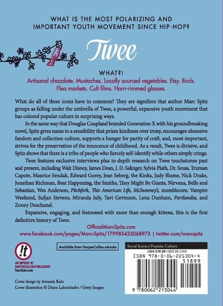 What is the most polarizing and important youth movement since Hip-Hop? Twee What?! Artisanal chocolate. Mustaches. Locally sourced vegetables. Etsy. Birds. Flea markets. Cult films. Horn-rimmed glasses. What do all of these icons have in common? They are signifiers that author Marc Spitz groups as falling under the umbrella of Twee, a powerful, expansive youth movement that has colored popular culture in surprising ways. In the same way that Douglas Coupland branded Generation X with his groundbreaking novel, Spitz gives name to a sensibility that prizes kindness over irony, encourages obsessive fandom and collection culture, supports a hunger for purity of craft, and, most important, strives for the preservation of the innocence of childhood. As a result, Twee is divisive, and Spitz shows that there is a tribe of people who fiercely self-identify while others simply cringe. Twee features exclusive interviews plus in-depth research on Twee touchstones past and present, including Walt Disney, James Dean, J. D. Salinger, Sylvia Plath, Dr. Seuss, Truman Capote, Maurice Sendak, Edward Gorey, Jean Seberg, the Kinks, Judy Blume, Nick Drake, Jonathan Richman, Beat Happening, the Smiths, They Might Be Giants, Nirvana, Belle and Sebastian, Wes Anderson, Pitchfork, This American Life, McSweeney's, mumblecore, Vampire Weekend, Sufjan Stevens, Miranda July, Tavi Gevinson, Lena Dunham, Portlandia, and Zooey Deschanel. Expansive, engaging, and festooned with more than enough kittens, this is the first definitive history of Twee.