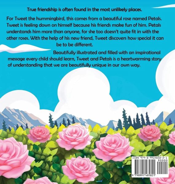 Tweet and Petals: A Heartwarming Tale of Unlikely Friendship and Embracing Differences Discover the enchanting story of "Tweet and Petals," a beautifully illustrated children's book that teaches the value of self-acceptance, emotional growth, and the joy of embracing what makes us unique. Perfect for young readers ages 4-8, this delightful book will inspire kids to celebrate their individuality and appreciate the differences in others. Meet Tweet, a tender- hearted hummingbird with a special talent that makes his flight truly one of a kind. Despite his gift, Tweet often finds himself the target of teasing from his friends, leaving him feeling isolated and like an outsider. He can't help but wonder if he'll ever find a place where he truly belongs and is accepted for who he is. Enter Petals, a stunning rose who has experienced her own journey of being different. With her deep understanding and gentle spirit, Petals knows all too well what it's like to be unique. When Tweet and Petals meet, they forge a surprising and beautiful friendship that changes everything. Together, Tweet and Petals embark on a journey of self-discovery, learning that being different is not only acceptable but something to be celebrated. Key Features:Inspirational Storyline: Encourages children to appreciate their individuality and build self-confidence. Heartwarming Friendship: Showcases the beauty of unlikely friendships and the strength found in accepting one another. Captivating Illustrations: Gorgeous, vibrant artwork that brings Tweet and Petals' world to life. Emotional Growth: A valuable resource for parents and educators to discuss emotions, self-esteem, and kindness. Ideal for bedtime stories, classroom readings, or sharing special moments with family, "Tweet and Petals" is more than just a book-it's a celebration of what makes each of us special. Let Tweet and Petals inspire your child to embrace their uniqueness and find joy in the differences that make us all extraordinary.