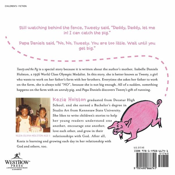 Still watching behind the fence, Tweety said, "Daddy, Daddy, let me in! I can catch the pig." Papa Daniels said, "No, No, Tweety. You are too little. Wait until you get big." Tweety and the Pig is a special story because it is written about the author's mother, Isabelle Daniels Holston, a 1956 World Class Olympic Medalist. In this story, she is better known as Tweety, a girl who wants to work on her father's farm with her brothers. Everytime she askes her father to work on the farm, she is always told "NO", because she is not big enough. All of a sudden, something happens on the farm with an unruly pig, and Papa Daniels discovers Tweety's gift of running.
