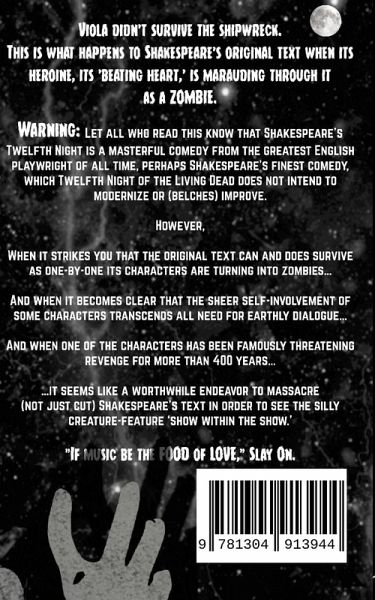 Viola didn't survive the shipwreck. This is what happens to Shakespeare's original text of TWELFTH NIGHT when its heroine, its 'beating heart,' is marauding through it as a ZOMBIE. WARNING: Let all who read this know that Shakespeare's Twelfth Night is a masterful comedy from the greatest English playwright of all time, perhaps Shakespeare's finest comedy, which Twelfth Night of the Living Dead does not intend to modernize or (belches) improve. However, When it strikes you that the original text can and does survive as one-by-one its characters are turning into zombies... And when it becomes clear that the sheer self-involvement of some characters transcends all need for earthly dialogue... And when one of the characters has been famously threatening revenge for more than 400 years... ...it seems like a worthwhile endeavor to massacre (not just cut) Shakespeare's text in order to see the silly creature-feature 'show within the show.' "If music be the FOOD of LOVE," Slay On.