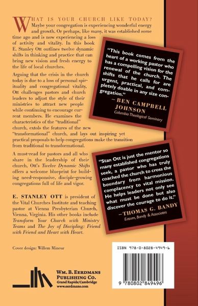 What is your church like today? Maybe your congregation is experiencing wonderful energy and growth. Or perhaps, like many, it was established some time ago and is now experiencing a loss of activity and vitality. In this book E. Stanley Ott outlines twelve dynamic shifts in thinking and practice that can bring new vision and fresh energy to the life of local churches. Arguing that the crisis in the church today is due to a loss of personal spirituality and congregational vitality, Ott challenges pastors and church leaders to adjust the style of their ministries to attract new people while continuing to encourage current members. He examines the characteristics of the "traditional" church, extols the features of the new "transformational" church, and lays out inspiring yet practical proposals to help congregations make the transition from traditional to transformational. A must-read for pastors and all who share in the leadership of their church, Ott's Twelve Dynamic Shifts offers a welcome blueprint for building need-responsive, disciple-growing congregations full of life and vigor.