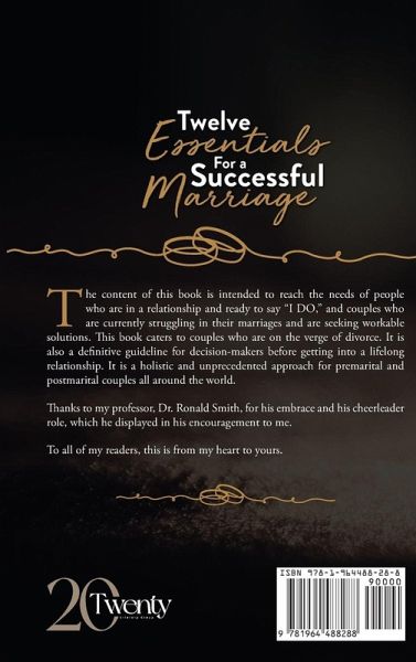 The content of this book is intended to reach the needs of people who are in a relationship and ready to say "I DO," and couples who are currently struggling in their marriages and are seeking workable solutions. This book caters to couples who are on the verge of divorce. It is also a definitive guideline for decision-makers before getting into a lifelong relationship. It is a holistic and unprecedented approach for premarital and postmarital couples all around the world. Thanks to my professor, Dr. Ronald Smith, for his embrace and his cheerleader role, which he displayed in his encouragement to me. To all of my readers, this is from my heart to yours.