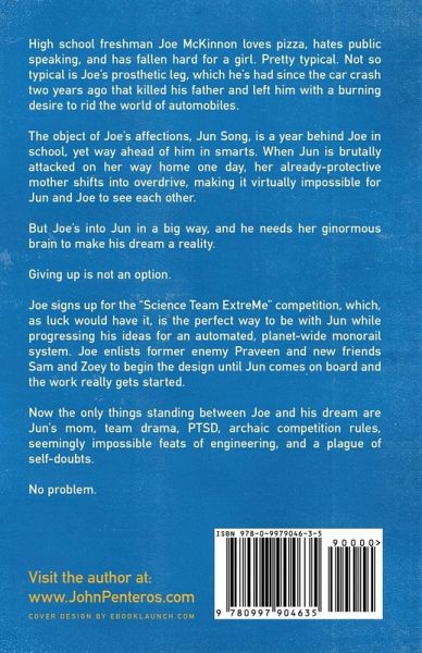 High school freshman Joe McKinnon loves pizza, hates public speaking, and has fallen hard for a girl. Pretty typical. Not so typical is Joe's prosthetic leg, which he's had since the car crash two years ago that killed his father and left him with a burning desire to rid the world of automobiles. The object of Joe's affections, Jun Song, is a year behind Joe in school, yet way ahead of him in smarts. When Jun is brutally attacked on her way home one day, her already-protective mother shifts into overdrive, making it virtually impossible for Jun and Joe to see each other. But Joe's into Jun in a big way, and he needs her ginormous brain to make his dream a reality. Giving up is not an option. Joe signs up for the "Science Team ExtreMe" competition, which, as luck would have it, is the perfect way to be with Jun while progressing his ideas for an automated, planet-wide monorail system. Joe enlists former enemy Praveen and new friends Sam and Zoey to begin the design until Jun comes on board and the work really gets started. Now the only things standing between Joe and his dream are Jun's mom, team drama, PTSD, archaic competition rules, seemingly impossible feats of engineering, and a plague of self-doubts. No problem.