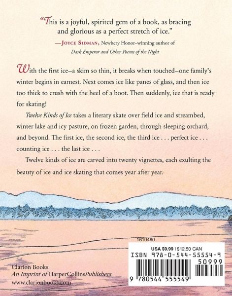 With the first ice-a skim on a sheep pail so thin, it breaks when touched-one family's winter begins in earnest. Next comes ice like panes of glass. And eventually, skating ice! Take a literary skate over field ice and streams, through sleeping orchards and beyond. The first ice, the second ice, the third ice . . . perfect ice . . . the last ice . . . Twelve kinds of ice are carved into twenty nostalgic vignettes, illustrated in elegantly scratched detail by the award-winning Barbara McClintock.