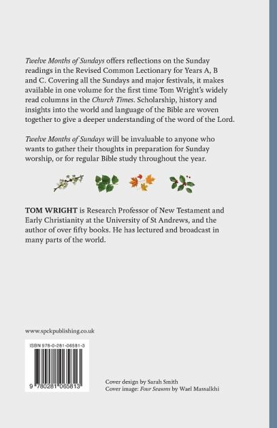 Twelve Months of Sundays offers reflections on the Sunday readings in the Revised Common Lectionary for Years A, B and C. Covering all the Sundays and major festivals, it makes available in one volume for the first time Tom Wright's widely read columns in the Church Times. Scholarship, history and insights into the world and language of the Bible are woven together to give a deeper understanding of the word of the Lord. Twelve Months of Sundays will be invaluable to anyone who wants to gather their thoughts in preparation for Sunday worship, or for regular Bible study throughout the year.