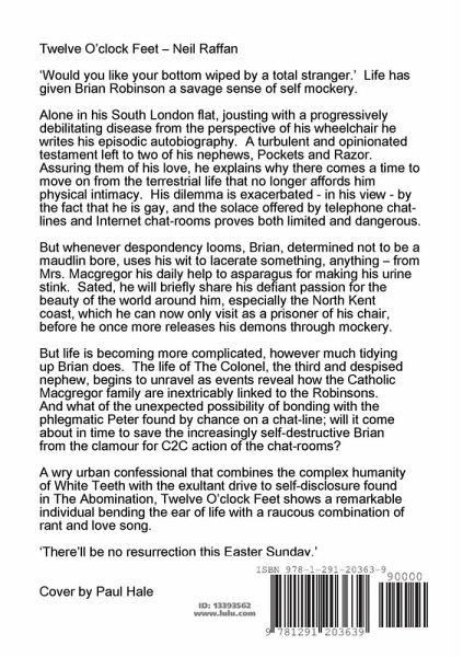 'Would you like your bottom wiped by a total stranger.' Life has given Brian Robinson a savage sense of self-mockery. A turbulent and opinionated testament left to two of his nephews, Pockets and Razor. Assuring them of his love, he explains why there comes a time to move on from the terrestrial life that no longer affords him physical intimacy. But life is becoming more complicated, however much tidying up Brian does. The life of The Colonel, the third and despised nephew, begins to unravel as events reveal how the Catholic Macgregor family are inextricably linked to the Robinsons. And what of the unexpected possibility of bonding with the phlegmatic Peter found by chance on a chat-line. A wry urban confessional that combines the complex humanity of White Teeth with the exultant drive to self-disclosure found in The Abomination, Twelve O'clock Feet shows a remarkable individual bending the ear of life with a raucous combination of rant and love song. 'There'll be no resurrection this Easter Sunday.'