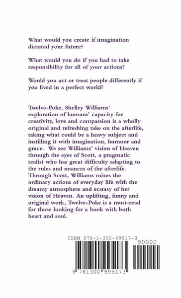 What would you create if imagination dictated your future? What would you do if you had to take responsibility for all of your actions? Would you act or treat people differently if you lived in a perfect world? Twelve-Poke, Shelley Williams' exploration of humans' capacity for creativity, love and compassion is a wholly original and refreshing take on the afterlife, taking what could be a heavy subject and instilling it with imagination, humour and grace. We see Williams' vision of Heaven through the eyes of Scott, a pragmatic realist who has great difficulty adapting to the rules and nuances of the afterlife. Through Scott, Williams mixes the ordinary actions of everyday life with the dreamy atmosphere and ecstasy of her vision of Heaven. An uplifting, funny and original work, Twelve-Poke is a must-read for those looking for a book with both heart and soul.