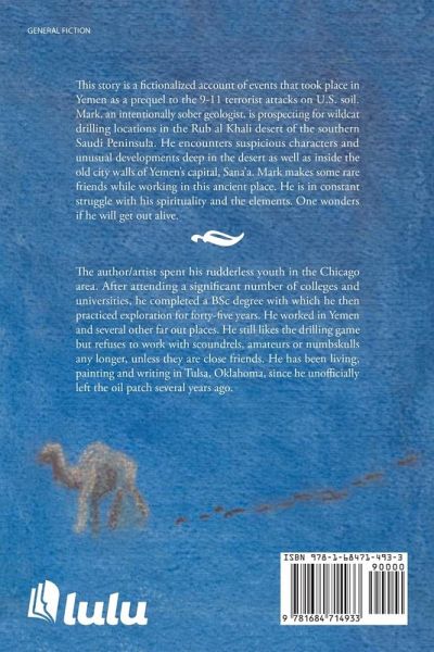 This story is a fictionalized account of events that took place in Yemen as a prequel to the 9-11 terrorist attacks on U.S. soil. Mark, an intentionally sober geologist, is prospecting for wildcat drilling locations in the Rub al Khali desert of the southern Saudi Peninsula. He encounters suspicious characters and unusual developments deep in the desert as well as inside the old city walls of Yemen's capital, Sana'a. Mark makes some rare friends while working in this ancient place. He is in constant struggle with his spirituality and the elements. One wonders if he will get out alive.