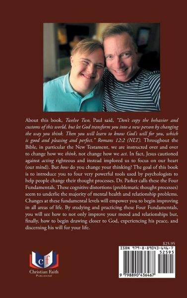 About this book, Twelve Two, Paul said, "Don't copy the behavior and customs of this world, but let God transform you into a new person by changing the way you think. Then you will learn to know God's will for you, which is good and pleasing and perfect." Romans 12:2 (NLT). Throughout the Bible, in particular the New Testament, we are instructed over and over to change how we think, not change how we act. In fact, Jesus cautioned against acting righteous and instead implored us to focus on our heart (our mind). But how do you change your thinking? The goal of this book is to introduce you to four very powerful tools used by psychologists to help people change their thought processes. Dr. Parker calls these the Four Fundamentals. These cognitive distortions (problematic thought processes) seem to underlie the majority of mental health and relationship problems. Changes at these fundamental levels will empower you to begin improving in all areas of life. By studying and practicing these Four Fundamentals, you will see how to not only improve your mood and relationships but, finally, how to begin drawing closer to God, experiencing his peace, and discerning his will for your life.