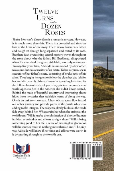 Twelve Urns and a Dozen Roses is a romantic mystery. However, it is much more than this. There is a powerful and timeless love at the heart of the story. There is love between a father and daughter, though long separated and tested to its core. But there is an overarching central mystery woven throughout the story about why the father, Bill Burkhead, disappeared when his cherished daughter, Adelaide, was only seventeen. Twenty-five years later, Adelaide is summoned by a law office to assume duties as executor of an estate. To her surprise, she is executor of her father's estate, consisting of twelve urns of his ashes. Thus begins her quest to follow the clues her dad left for her and discover his ultimate intent in spreading his ashes. As she follows his twelve envelopes of cryptic instructions, a new world opens to her in the America she didn't know existed. Behind the mask of beautiful country and interesting places hides three mysteries that Adelaide learns of along the way. One is an unknown woman. A host of characters flow in and out of her journey and provide pieces of the puzzle while also adding to the intrigue. The suspense slowly builds as the roads fade away behind her. What awaits her when she arrives at the twelfth urn? Will it just be the culmination of a host of human frailties, of mistakes and efforts to right them? Will it bring something good to her life, a sense of meaningless gloom, or will the journey result in nothing more than an end? The only way Adelaide will know if her time and efforts were worth it is by pushing through to the twelfth urn.