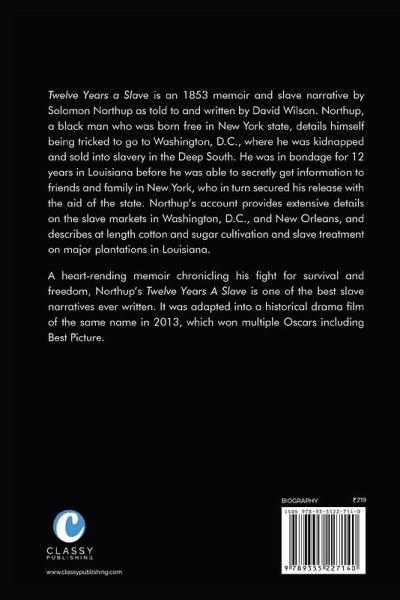 Twelve Years a Slave is an 1853 memoir and slave narrative by Solomon Northup as told to and written by David Wilson. Northup, a black man who was born free in New York state, details himself being tricked to go to Washington, D.C., where he was kidnapped and sold into slavery in the Deep South. He was in bondage for 12 years in Louisiana before he was able to secretly get information to friends and family in New York, who in turn secured his release with the aid of the state. Northup's account provides extensive details on the slave markets in Washington, D.C., and New Orleans, and describes at length cotton and sugar cultivation and slave treatment on major plantations in Louisiana.A heart-rending memoir chronicling his fight for survival and freedom, Northup's Twelve Years A Slave is one of the best slave narratives ever written. It was adapted into a historical drama film of the same name in 2013, which won multiple Oscars including Best Picture.