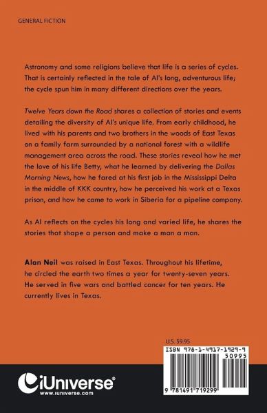 Astronomy and some religions believe that life is a series of cycles. That is certainly reflected in the tale of Al's long, adventurous life; the cycle spun him in many different directions over the years. Twelve Years down the Road shares a collection of stories and events detailing the diversity of Al's unique life. From early childhood, he lived with his parents and two brothers in the woods of East Texas on a family farm surrounded by a national forest with a wildlife management area across the road. These stories reveal how he met the love of his life Betty, what he learned by delivering the Dallas Morning News, how he fared at his fi rst job in the Mississippi Delta in the middle of KKK country, how he perceived his work at a Texas prison, and how he came to work in Siberia for a pipeline company. As Al reflects on the cycles his long and varied life, he shares the stories that shape a person and make a man a man.