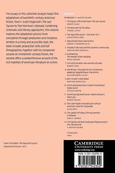 Introduction R. Barton Palmer; 1. Filming an unfinished novel: The Last Tycoon Robert Sklar; 2. The texts behind The Killers Thomas Leitch; 3. Turning The Day of the Locust into a film Chris Ames; 4. Ship of Fools: from novel to film Robert H. Brinkmeyer Jr.; 5. Intruder in the Dust and the Southern community Mark Royden Winchell; 6. The dramatization of Carson McCullers's The Member of the Wedding McKay Jenkins; 7. Film and narration: two versions of Lolita Robert Stam; 8. World War II through the lens of Vietnam: adapting Slaughterhouse-Five to film Rodney Allen; 9. John Huston's Wise Blood Matthew Bernstein; 10. Genre and authorship in David Cronenberg's Naked Lunch Steffen Hantke; 11. Screening Raymond Carver: Robert Altman's Short Cuts Robert Kolker; 12. The Color Purple: translating the African American novel for Hollywood Allen Woll; 13. The specter of history: filming memory in Beloved Marc C. Conner; 14. Filming the spiritual landscape of James Jones's The Thin Red Line R. Barton Palmer.