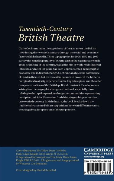 In this book, Claire Cochrane maps the experience of theatre across the British Isles during the twentieth century through the social and economic factors which shaped it. Three topographies for 1900, 1950 and 2000 survey the complex plurality of theatre within the nation-state which at the beginning of the century was at the hub of world-wide imperial interests and after one hundred years had seen unprecedented demographic, economic and industrial change. Cochrane analyses the dominance of London theatre, but redresses the balance in favour of the hitherto marginalised majority experience in the English regions and the other component nations of the British political construct. Developments arising from demographic change are outlined, especially those relating to the rapid expansion of migrant communities representing multiple ethnicities. Presenting fresh historiographic perspectives on twentieth-century British theatre, the book breaks down the traditionally accepted binary oppositions between different sectors, showing a broader spectrum of theatre practice.