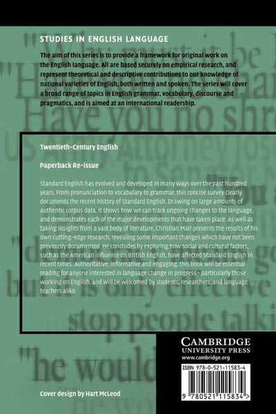 Standard English has evolved and developed in many ways over the past hundred years. From pronunciation to vocabulary to grammar, this concise survey clearly documents the recent history of Standard English. Drawing on large amounts of authentic corpus data, it shows how we can track ongoing changes to the language, and demonstrates each of the major developments that have taken place. As well as taking insights from a vast body of literature, Christian Mair presents the results of his own cutting-edge research, revealing some important changes which have not been previously documented. He concludes by exploring how social and cultural factors, such as the American influence on British English, have affected Standard English in recent times. Authoritative, informative and engaging, this book will be essential reading for anyone interested in language change in progress, particularly those working on English, and will be welcomed by students, researchers and language teachers alike.