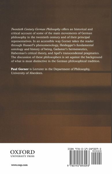 This book offers an historical and critical account of the important German philosophical movements and philosophers of the 20th century. In an accessible way, Gorner introduces the reader to a principal representative of each movement, laying out Husserl's phenomenology, Gadamar's hermeneutics, Habermas's critical theory, and Apel's pragmatics, and giving extensive treatment of Heideggar's multi-disciplinary work. Twentieth Century German Philosophy provides the general reader with an incisive discussion of these philosophers and philosophies against a background of the distinctive German tradition. This comprehensive introduction to German philosophy in the 20th Century will be illuminating reading for those seeking a closer understanding of the German tradition, from the monumentally important work of Heidegger to the popular ideas of hermeneutics and critical theory.