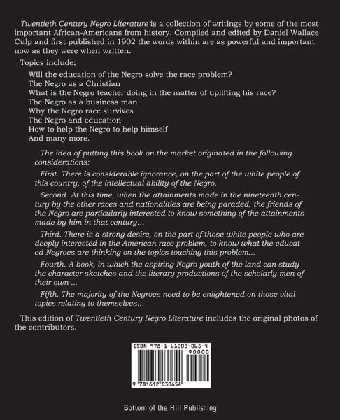 Twentieth Century Negro Literature is a collection of writings by some of the most important African-Americans from history. Compiled and edited by Daniel Wallace Culp and first published in 1902 the words within are as powerful and important now as they were when written. Topics include; Will the education of the Negro solve the race problem? The Negro as a Christian What is the Negro teacher doing in the matter of uplifting his race? The Negro as a business man Why the Negro race survives The Negro and education How to help the Negro to help himself And many more. The idea of putting this book on the market originated in the following considerations: First. There is considerable ignorance, on the part of the white people of this country, of the intellectual ability of the Negro. Second. At this time, when the attainments made in the nineteenth century by the other races and nationalities are being paraded, the friends of the Negro are particularly interested to know something of the attainments made by him in that century... Third. There is a strong desire, on the part of those white people who are deeply interested in the American race problem, to know what the educated Negroes are thinking on the topics touching this problem... Fourth. A book, in which the aspiring Negro youth of the land can study the character sketches and the literary productions of the scholarly men of their own ... Fifth. The majority of the Negroes need to be enlightened on those vital topics relating to themselves... This edition of Twentieth Century Negro Literature includes the original photos of the contributors.