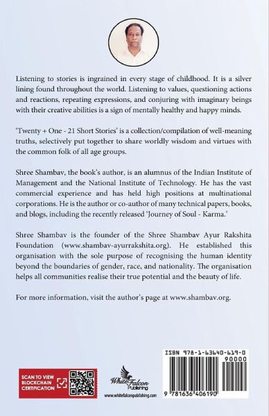 Listening to stories is ingrained in every stage of childhood. Which is a silver lining found throughout the world. Listening to values, questioning actions and reactions, repeating expressions, and conjuring with imaginary beings with their creative abilities is a sign of mentally healthy and happy minds. We grew up hearing and imagining folkloric characters, stories from the Puranas, Mahabharata, Ramayana, fairy tales, and fables. Many of them would be bedtime stories told to us by our parents and grandparents - the everlasting, evergreen childhood memories. Storytelling is still a powerful tool for strengthening family bonds. 'Twenty + One - Short Stories' is a collection/compilation of well-meaning truths, selectively put together to share worldly wisdom and virtues with the common folk of all age groups. Shree Shambav, the author of this book, is an alumnus of the Indian Institute of Management and the National Institute of Technology with extensive experience in the business world and has held senior positions at MNC. He is the author and co-author of many technical articles, books, and blogs. And he is also an author of recently released new book - 'Journey of Soul - Karma'. Shree Shambav is the founder of the Shree Shambav Ayur Rakshita Foundation (www.shambav-ayurrakshita.org). He established this organisation with the sole purpose of recognising the human identity beyond the boundaries of gender, race, and nationality. The organisation helps all communities realise their true potential and the beauty of life. For more information, visit the author's page at www.shambav.org.