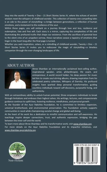 Twenty + One - 21 Short Stories Series IV is more than a collection of narratives-it is an odyssey through the human soul, an intimate embrace of life's complexities, and a whispered reminder of the wisdom woven into our very existence. These twenty-one stories are not just words on a page; they are echoes of timeless truths, reflections of our deepest emotions, and gentle lanterns illuminating the uncharted paths of the heart.Since the dawn of time, stories have been the lifeblood of human connection. They have travelled across generations-nestled in the hushed tones of grandparents, painted in the shadows of flickering oil lamps, and carried by the winds of oral traditions. They have shaped civilisations, moulded destinies, and stood as silent sentinels to history's most profound moments. Yet, in the ceaseless rhythm of modern existence, the magic of storytelling often fades into the backdrop of responsibility, urgency, and routine.But stories never abandon us. They wait, patiently, until we are ready to listen again.In this carefully woven collection, you will journey through narratives that transcend mere entertainment, offering glimpses into love and longing, triumph and tragedy, loss and redemption. Each tale is a universe unto itself, a window into the myriad shades of human existence.These Twenty One stories are more than ink on paper; they are soulprints, capturing fleeting moments of truth and emotion. They invite you to pause, to reflect, to feel deeply. Within these pages, you may find a piece of yourself-an old dream, a forgotten lesson, or the rekindling of wonder long lost.Step into this world of storytelling, and let these tales breathe life into your spirit once more.